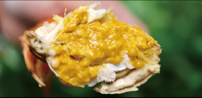 黃油相融,難分彼此。油膏浸滿(mǎn)整只蟹身,腹肉、蟹腿、蟹螯,甚至蟹腮,全身都金黃透光。細(xì)細(xì)品嘗,渾身散發(fā)一股霸道的鮮甜,是普通青蟹的10余倍,簡(jiǎn)直就是“人間尤物”。